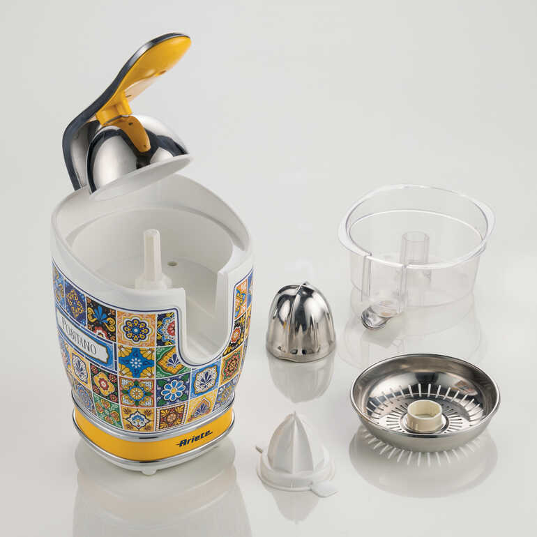 Positano elektrikli narenciye sıkacağı, metal gövdesiyle dayanıklı, şık bir tasarım. Küçük ve büyük meyveler için iki farklı sıkma konisi ve damlatmayan özel musluk ile konforlu kullanım sunar.