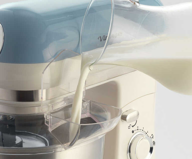 Büyük 5,5 lt paslanmaz çelik kase, 3 çırpma teli, yoğurmak için hamur kancası ve karıştırmak için kalp şeklinde çırpıcı tel mevcuttur.