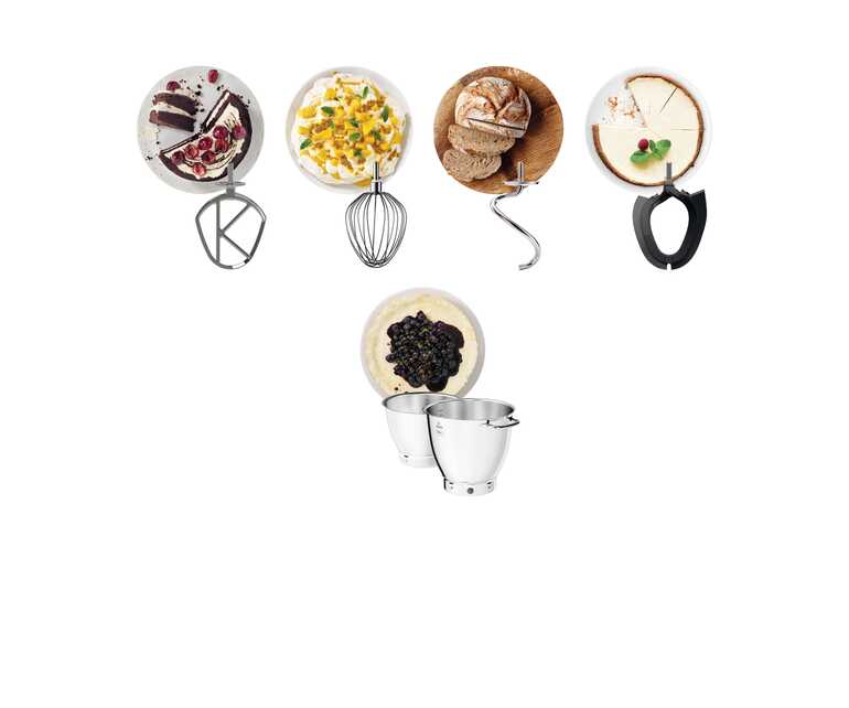 - 4 Farklı hazne aparatı: K-Çırpıcı, Güçlü Çırpıcı, Hamur Kancası, Krema Çırpıcı