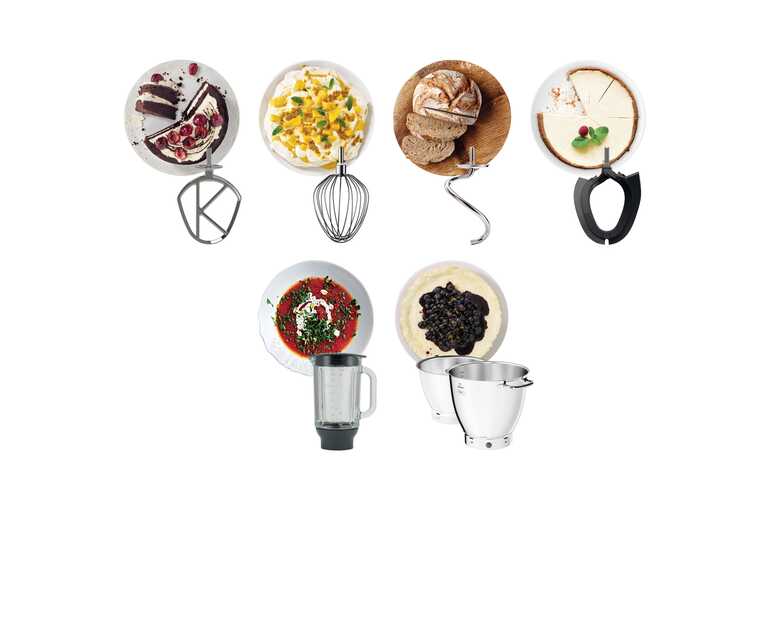- 4 Farklı hazne aparatı- K-Çırpıcı, Güçlü Çırpıcı, Hamur Kancası, Krema Çırpıcı